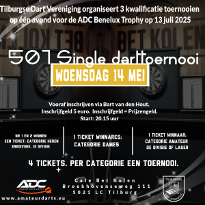Op 14 mei 2025 speelde deze darters een kwalificatie toernooi voor 4 tickets van de ADC Europe. 4 tickets voor de Benelux Throphy die wordt gehouden in De Mambo te Kortrijk. Misschien dat dat een reden was waardoor het niet zo druk was op het toernooi. De kilometers die je moet maken naar Kortrijk, vergeet natuurlijk niet het goede weer plus het was heel spannend bij het voetbal. Vooral bij PSV, Willem II en AJAX. Maar dat wilde niet zeggen dat er bij de 2e divisie en lager toch een leuke gezellige groep van 12 man gingen darten voor de tickets. 3 poules van 4 werden er gemaakt, na de poulefase had iedereen nog kans op een ticket. Wel was het meteen de knock out fase. Uiteindelijk ging Reinier Verhulst er met de ticket vandoor. Kwart finales.  Robin Robbe - Richard van Hamont Johan Vorstenbosch - Mike Thijssen Reinier Verhulst - Pim van der Heijden Richard van Eeten - Nicky Brakkee Halve finales. Richard van Hamont - Johan Vorstenbosch Reinier Verhulst - Richard van Eeten Finale. Richard van Hamont - Reinier Verhulst Bij de Heren Eredivisie/1e divisie gingen de tickets naar Carlo van Cleef en Joppe Bakens.Bij de Dames ging de ticket naar Priscilla Donnely.   Heel veel succes op de Benelux Trophy!